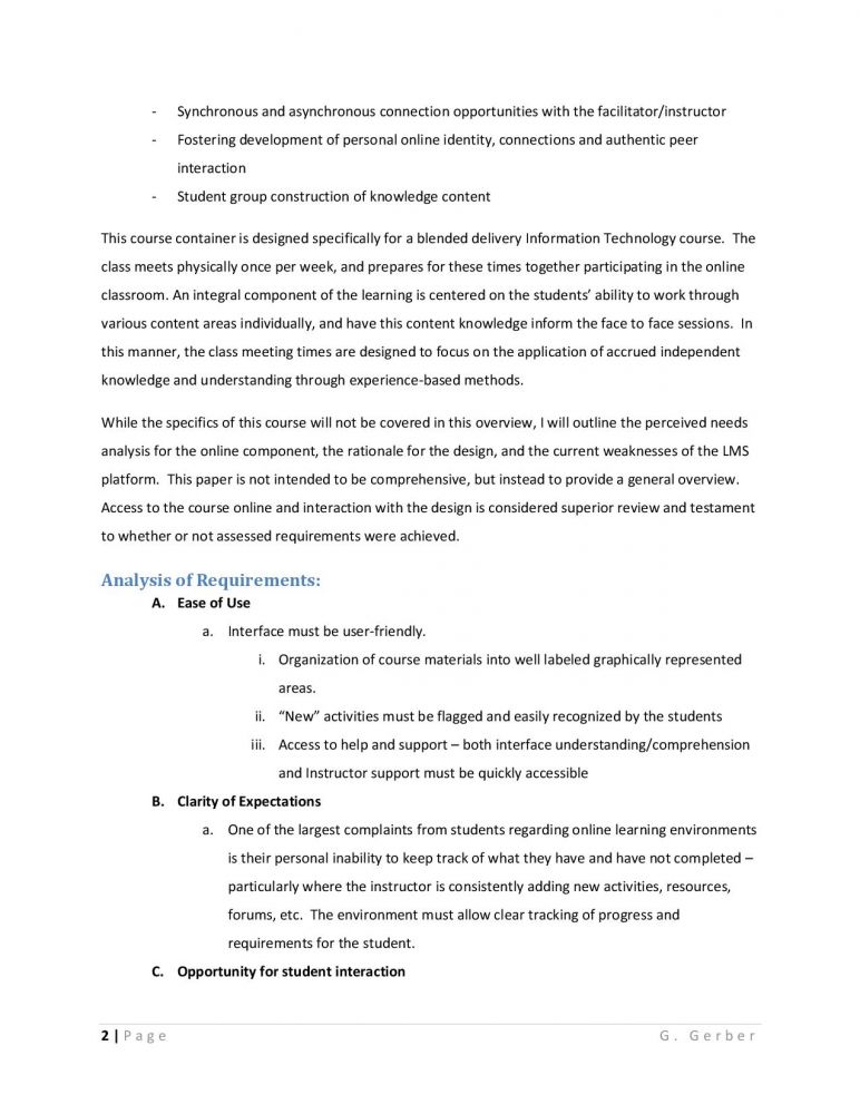 For this assignment, my focus will be to design an online curriculum delivery environment. I would like to devise a really good Moodle implementation while remaining cognizant of the short comings of this current tool. Based in learning theory and steeped in the current realities of internet technology, the designed learning environment will account for the needs of student tracking, individual learning modules, peer interactions, learning journals, Face-2-Face (through class site), embedded video integration, etc.