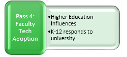 Further refining my research focus, the scope of understanding technology integration in instruction was limited to that of university faculty.  I pondered the possibility that research in the university adoption area would lead to a better understanding of the "trickle-down" effect to K-12 schools and their push or resistence to integrating technology in instruction and learning.