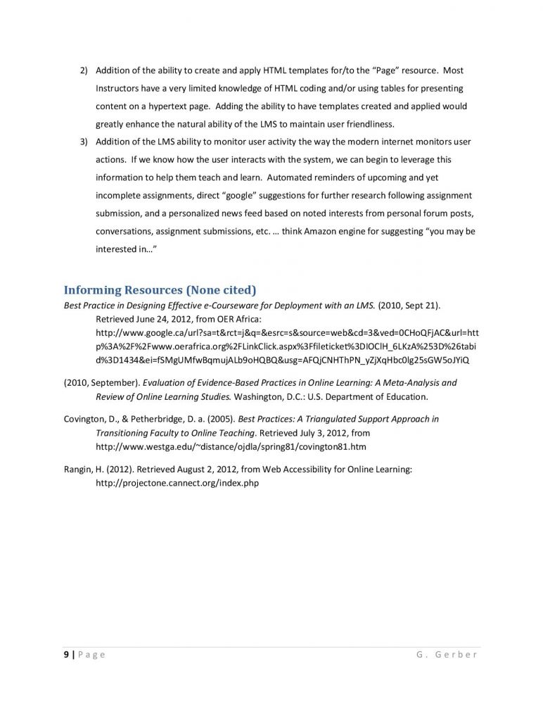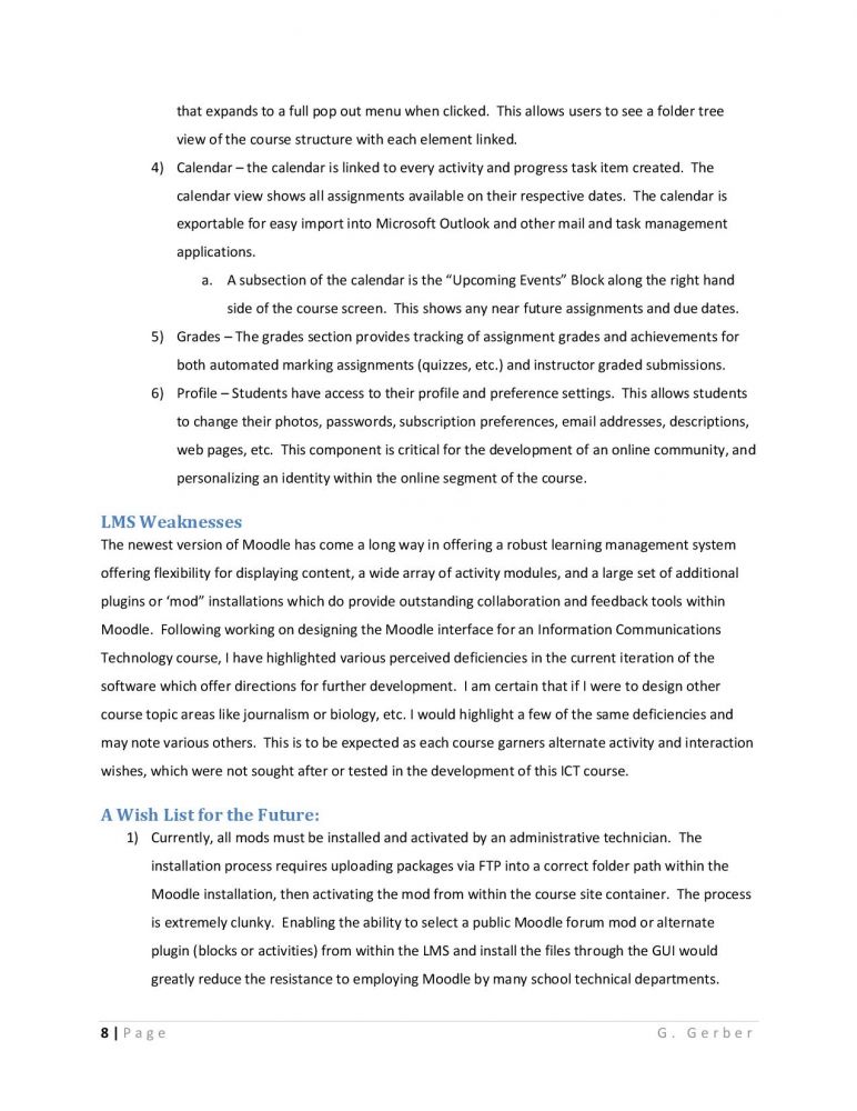 I will be taking into consideration many of the positives from other LMS's in addition to current shortcomings within this learning environment. One of my goals will be to submit a suggestion list and background work to the Moodle community for development and integration of the "missing" components.