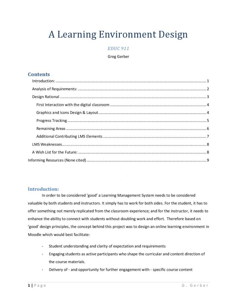 For this assignment, my focus will be to design an online curriculum delivery environment. I would like to devise a really good Moodle implementation while remaining cognizant of the short comings of this current tool. Based in learning theory and steeped in the current realities of internet technology, the designed learning environment will account for the needs of student tracking, individual learning modules, peer interactions, learning journals, Face-2-Face (through class site), embedded video integration, etc.